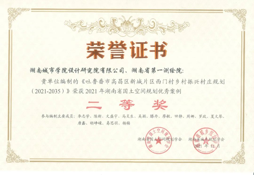 2021年,《吐鲁番市高昌区新城片区西门村乡村振兴村庄规划》荣获学会国土空间规划优秀案例评选二等奖。
