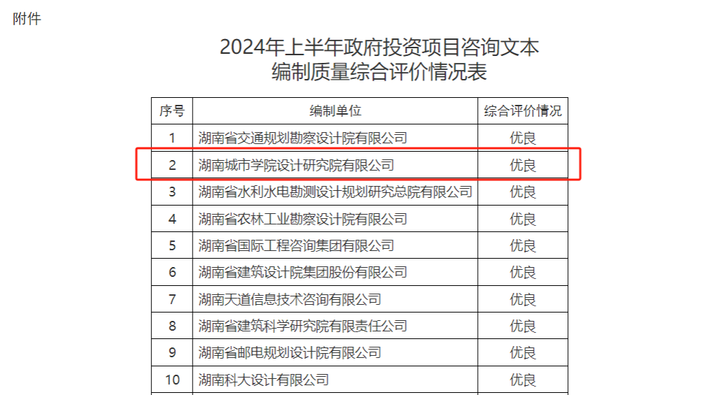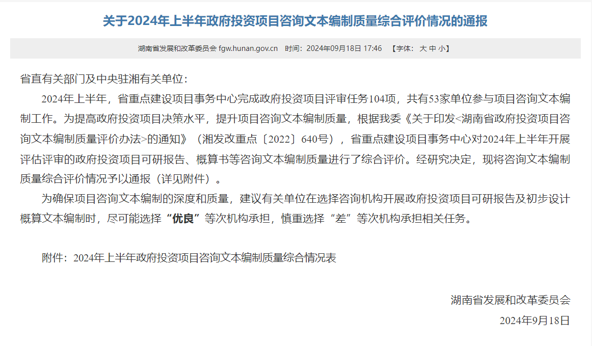 9月18日,湖南省发展和改革委员会发布《关于2024年上半年政府投资项目咨询文本编制质量综合评价情况的通报》,2024年上半年,省重点建设项目事务中心完成政府投资项目评审任务104项,共有53家单位参与项目咨询文本编制工作,省重点建设项目事务中心对2024年上半年开展评估评审的政府投资项目可研报告、概算书等咨询文本编制质量进行了综合评价。金年金字招牌诚信至上设计研究院有限公司获评优良(排名第二)。