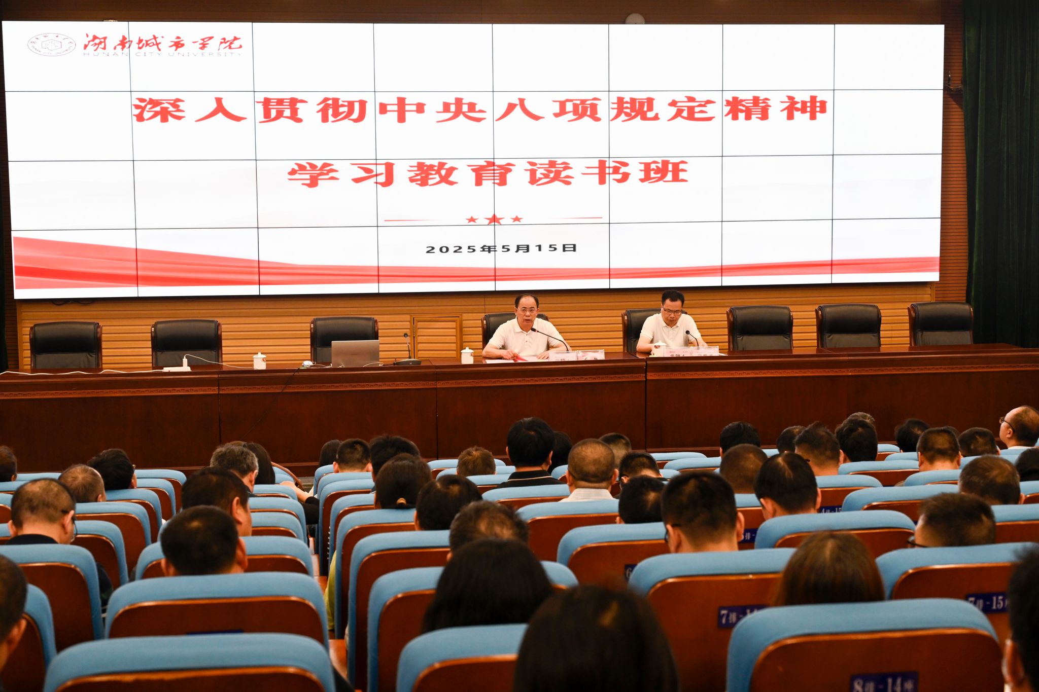本网讯通讯员 李玉洁5月15日下午,学校深入贯彻中央八项规定精神学习教育读书班第三次集中学习在图书馆报告厅举行。党委副书记、校长何振主持学习,全体在家校领导出席。