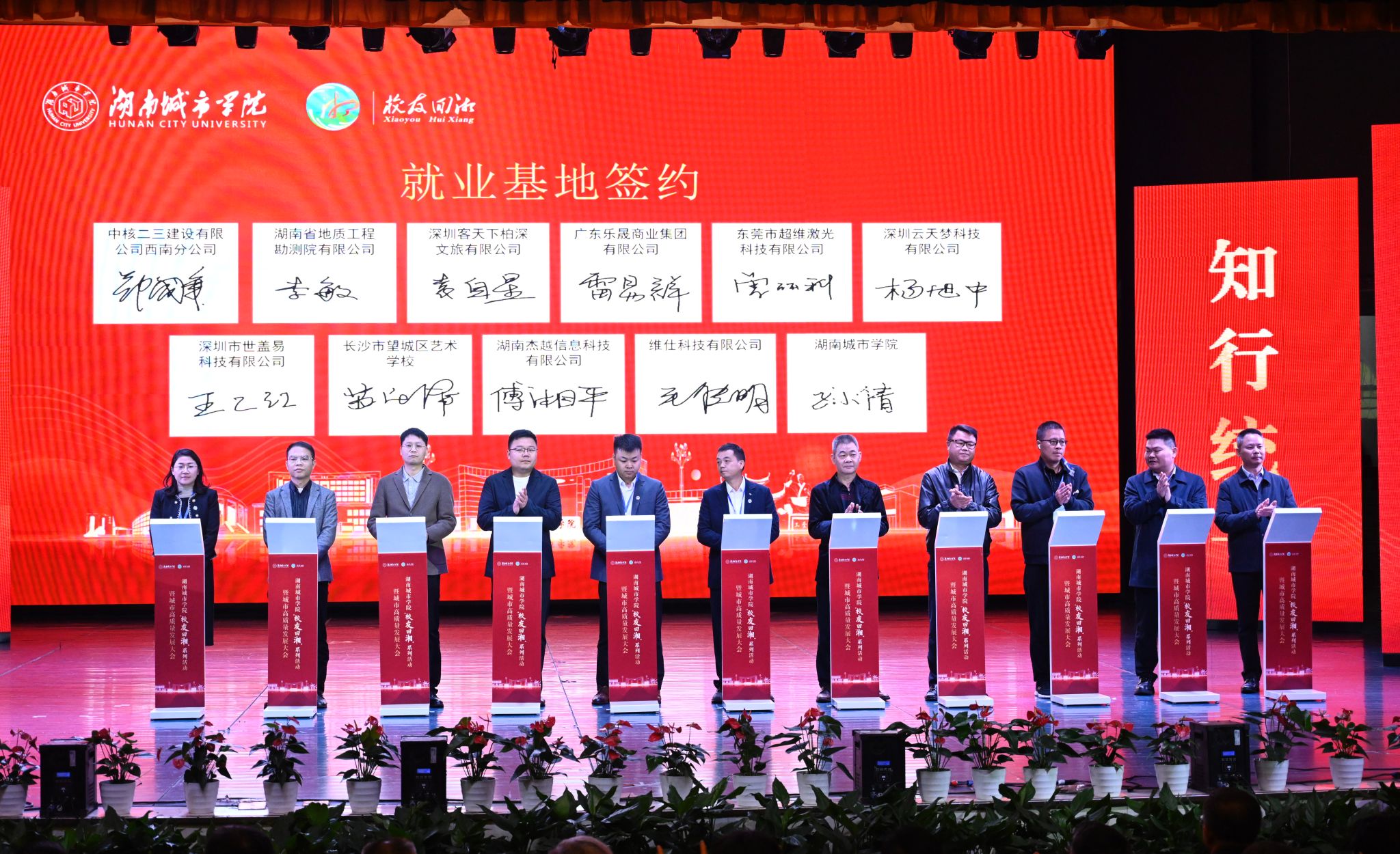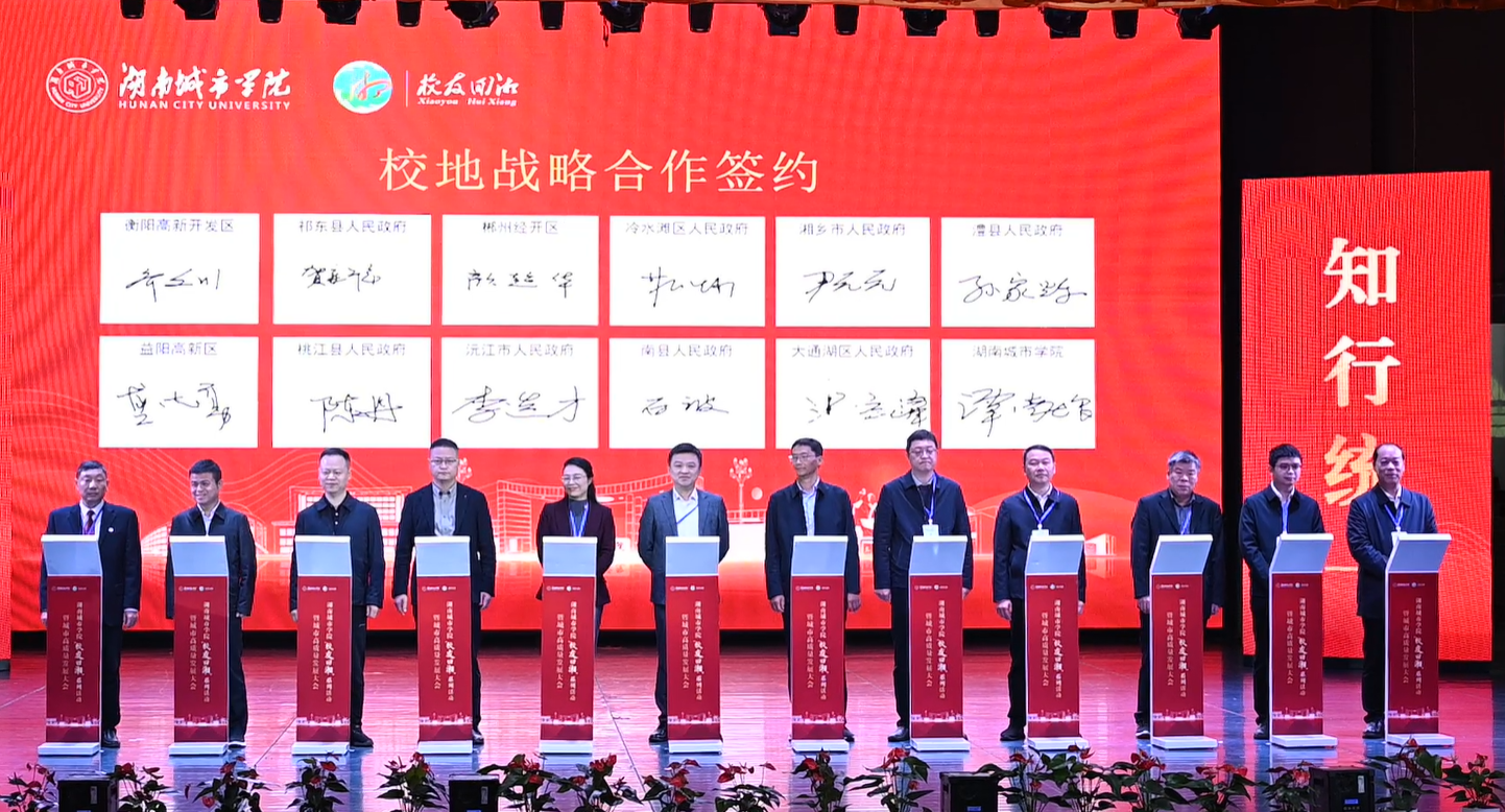 副校长谭献良、孙倩、雷存喜代表学校分别与衡阳高新开发区、祁东县人民政府等11个地方政府签订校地战略合作协议,与中核二三建设有限公司西南分公司、湖南省地质工程勘测院有限公司等10家企业签订校企就业基地协议,与中规院(北京)规划设计有限公司、中国核工业二四建设有限公司等15家企业、学校签订产教融合实习基地。