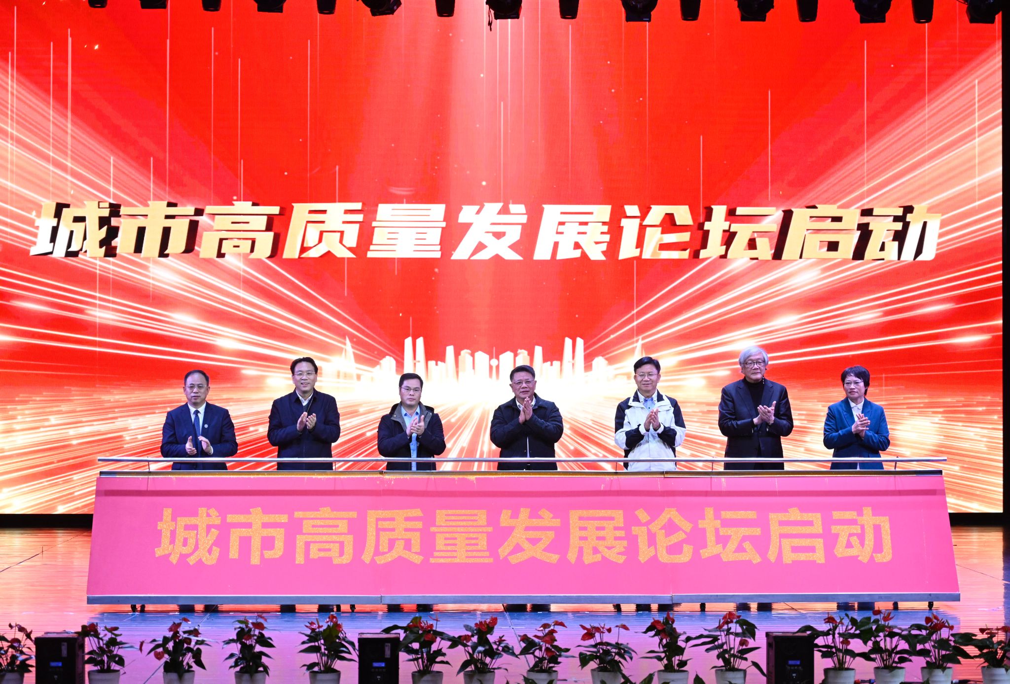 随后,桂振华、李晓江、肖国安、何振、易棉阳、罗晓皓、陈汉光共同上台推动推杆,正式启动城市高质量发展论坛。