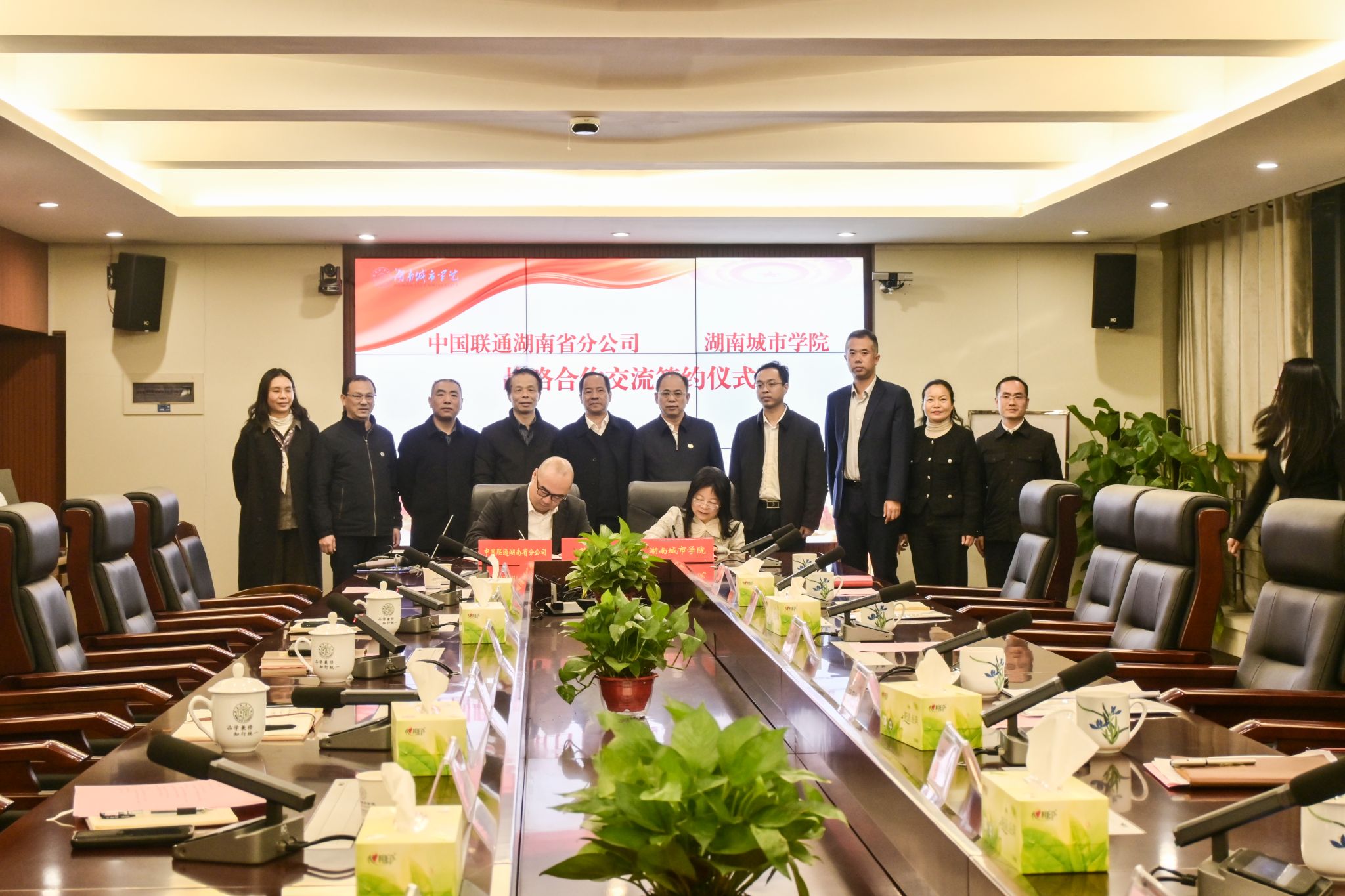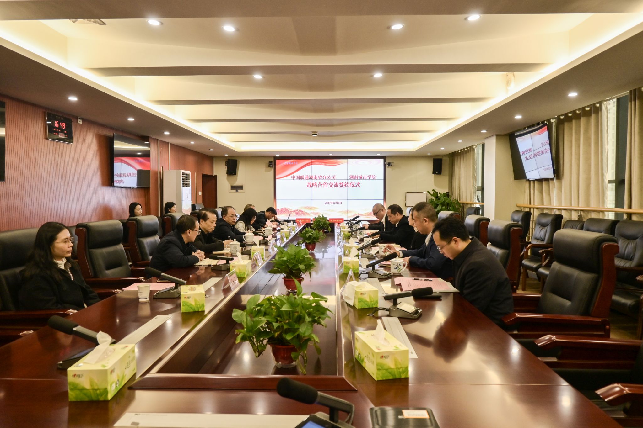 本网讯(智慧校园建设与管理中心供稿)为积极响应国家教育数字化战略,深化产教融合,推动高等教育数字化转型与高质量发展,12月9日下午,金年金官网与中国联合网络通信有限公司湖南省分公司(以下简称“湖南联通”)战略合作框架协议签约仪式在学校办公楼一会议室举行。学校党委书记何振、副校长徐姝,湖南联通党委书记、总经理周智,益阳联通总经理袁泉出席仪式。签约仪式由徐姝主持。