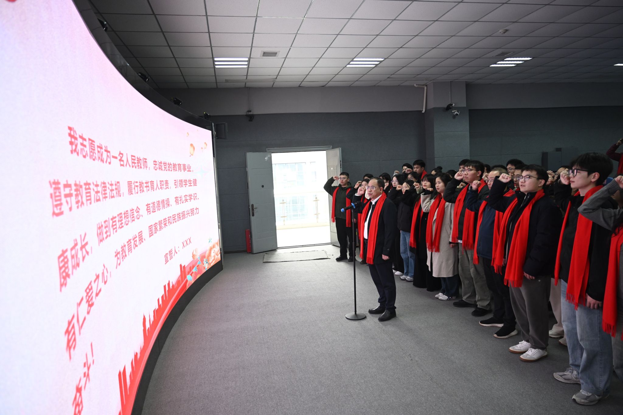 校党委书记何振带领全体新进教师庄严宣读教师誓词,铿锵誓言彰显了为党育人、为国育才的初心与决心。全体校领导为新进教师代表佩戴校徽,标志着他们正式成为金年金字招牌诚信至上大家庭的一员。