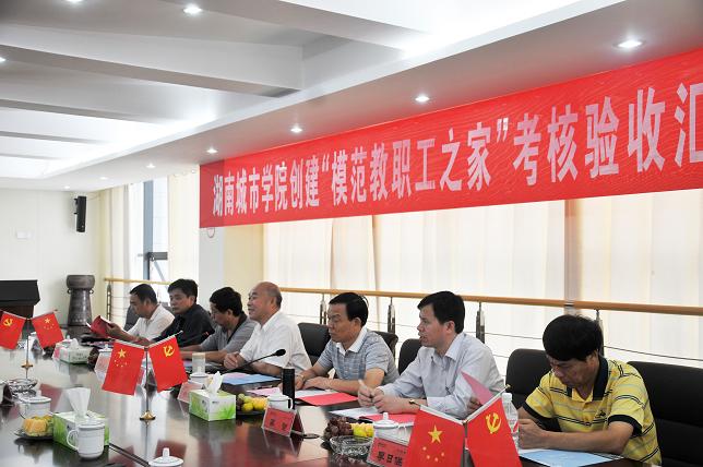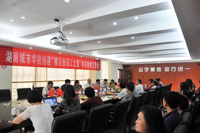 上午10点30分,考核验收汇报会在办公楼一会议室举行。学校党委书记赵运林,校长李建华,纪委书记、工会主席杨斌,以及校工会副主席、各党总支书记(含直属党支部书记)、分工会主席出席了汇报会。汇报会由省教育工会主席曹光荣主持。赵运林简要介绍了学校概况和支持工会建家活动的情况,并代表学校对检查组到来表示热烈欢迎。