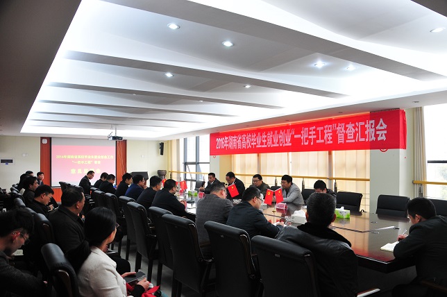 副校长汤放华就金年金官网毕业生就业创业工作“一把手工程”落实情况向督查组作了汇报。他重点介绍了金年金官网以建设湖南省就业创业示范校为契机,积极构建“一个目标,双轮驱动,三全服务,四课指导,五位一体精准帮扶就业”的就业创业工作新模式。