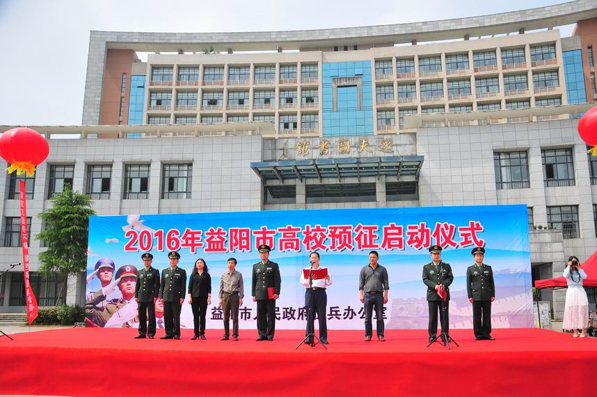 (本网讯)“保卫国家终不悔,绿色军营献青春”,“莘莘学子投笔从戎,参军报国建功立业”。4月27日下午,图书馆前坪广场悬挂满着各式与参军有关的横幅标语。为了让在校大学生了解部队、了解大学生入伍优惠政策,2016年益阳市高校预征启动仪式在金年金官网隆重举行。