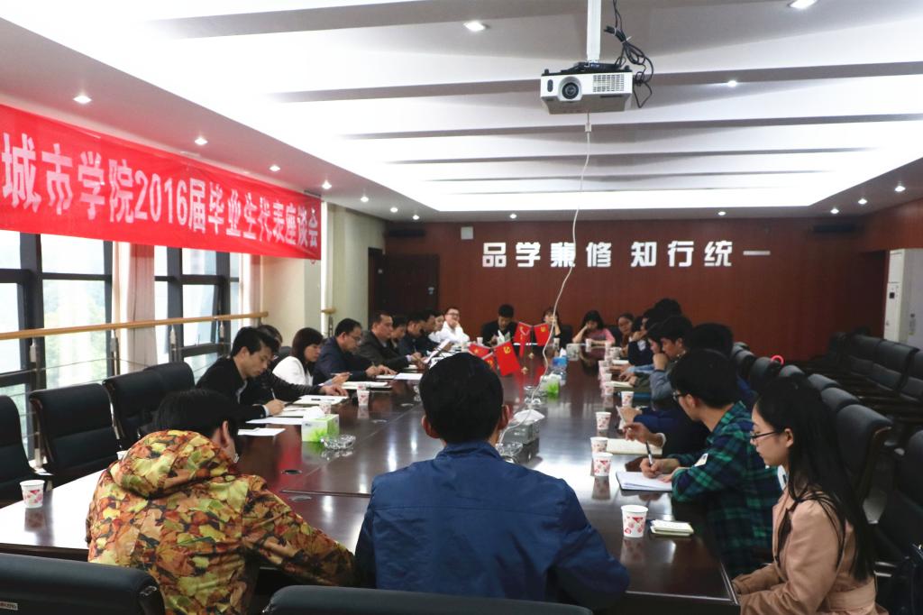 (本网讯)为了解金年金官网毕业生的就业形势,聆听毕业生对母校未来发展的建议与看法,5月26日下午14:30,金年金官网2016届毕业生代表座谈会在办公楼一会议室举行。副校长何振、雷存喜,学校相关部门负责人以及来自14个学院的18位毕业生代表参加了此次座谈会。会议由团委副书记王琦主持。