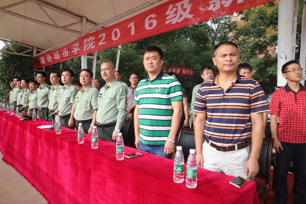 学校武装部宣布了“2016年军训营连建制”,学生处宣布了军训纪律;新生代表肖天祥同学和军训教官代表宋友斌分别作了表态发言。