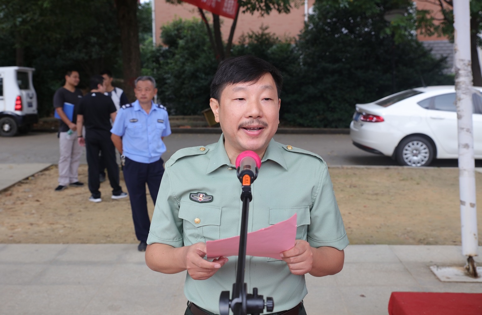 马宇斌代表承训部队发表讲话,他希望全体新生坚定信念,以一个军人的身份严格要求自己,认真学习各项技能,出色完成军训任务。