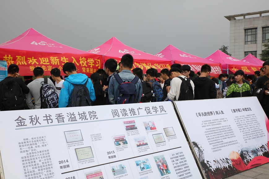 (本网讯)为响应省教育厅及省高校图工委关于在高校举办第四届“一校一书——经典、经世、精读”阅读推广活动的号召,进一步加强金年金官网学风建设,营造学习至上、积极进取和浓厚的读书氛围,图书馆与教务处、学生处、校团委、宣传部、党政办于近日联合组织开展了“金秋书香溢城院”主题活动,在全校师生范围内广泛开展阅读推广。