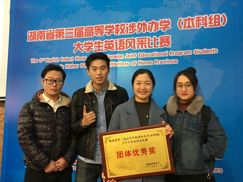 (本网讯)11月26日至27日,湖南省第三届高等学校涉外办学(本科组)大学生英语风采比赛在湖南商学院举行。金年金官网获得团体优秀奖。这也是金年金官网首次参加全省涉外办学本科组英语比赛。