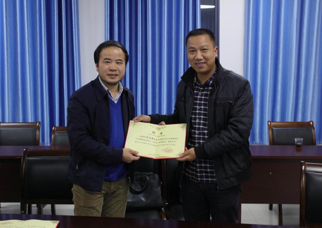 (本网讯)11月29日下午,湘潭大学公共管理学院院长盛明科和刘超副教授来校,聘任金年金官网城市管理学院和商学院4位教师为该校公共管理学院专业硕士指导教师。聘任仪式在城市管理学院会议室举行。副校长何振出席聘任仪式。
