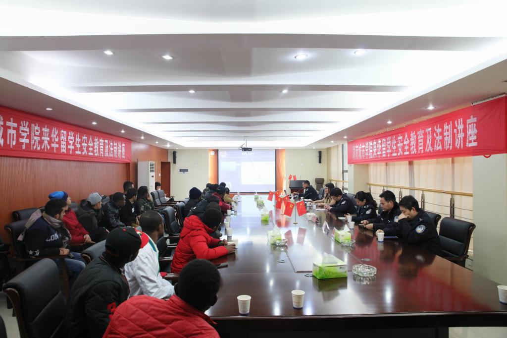 (本网讯)12月13日下午,金年金官网来华留学生安全教育与法制讲座在办公楼一会议室举行。副校长刘辉煌,益阳市公安局人口与出入境管理支队副支队长郭胜、大队长张强、外管专干彭娟、市公安局朝阳分局人口大队大队长邹亮、副大队长唐一波,金年金官网文学与新闻传播学院负责人、国际交流处全体人员以及来自加纳、也门和加拿大目前在校的22名来华留学生参加。讲座由国际交流处处长周桂平主持。