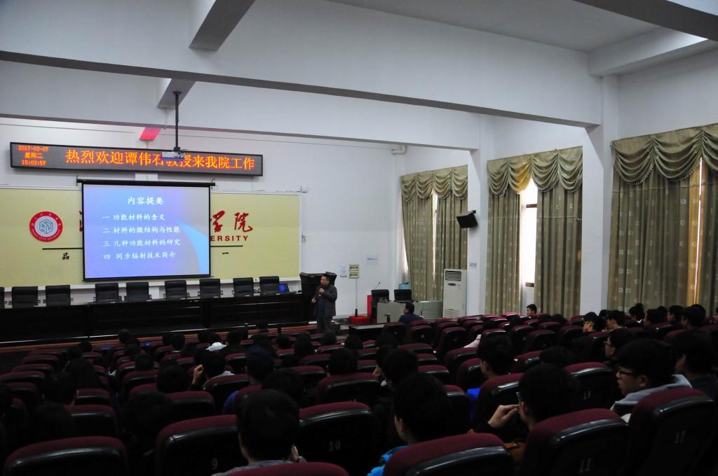 (本网讯)为实现学校转型发展和加强“双一流”建设,学校进一步加大了高层次人才引进力度。3月7日下午,金年金官网新引进教授、博士生导师、学科带头人谭伟石在电信楼视频会议室作了一场题为“几种功能材料的微结构、性能及同步辐射技术”的学术讲座,纪委书记姚春梅教授、人事处相关负责人,信息与电子工程学院全体教师、光电工程和物理专业学生听取了讲座。