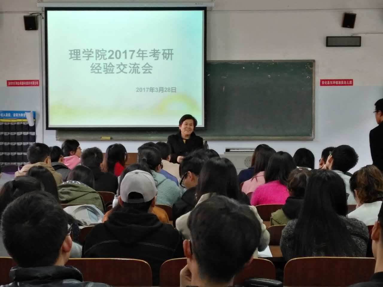 (本网讯)3月28日下午,理学院在二教学教222教室召开了2017年学生考研经验交流暨2018年考研动员会。理学院领导班子及博士、教授代表、辅导员等出席会议,理学院大二、大三全体学生及2017届考上研究生的毕业生代表参加会议。