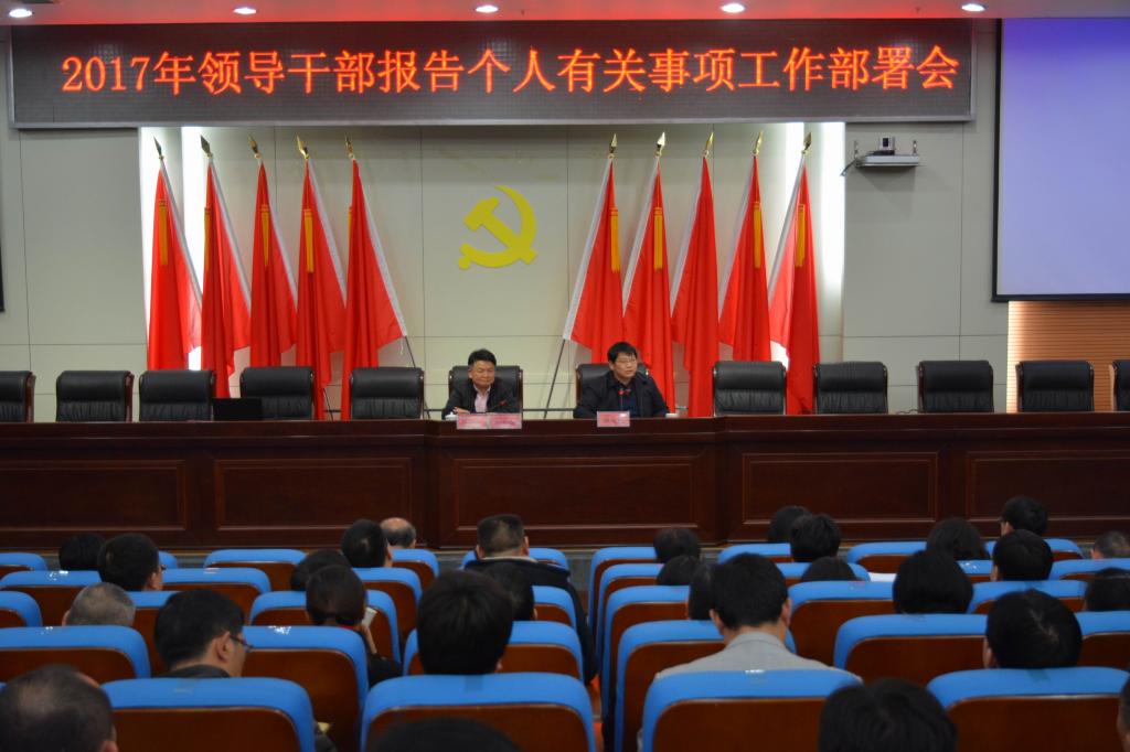 (本网讯)4月6日晚上7点,金年金官网在图书馆报告厅召开2017年领导干部报告个人有关事项工作部署会。校党委书记罗成翼,党委副书记汤放华,纪委书记姚春梅,党委委员、组织部长罗新湘,原党委副书记、副校长孟昭武出席会议,全体处级干部参加会议。会议由汤放华主持。