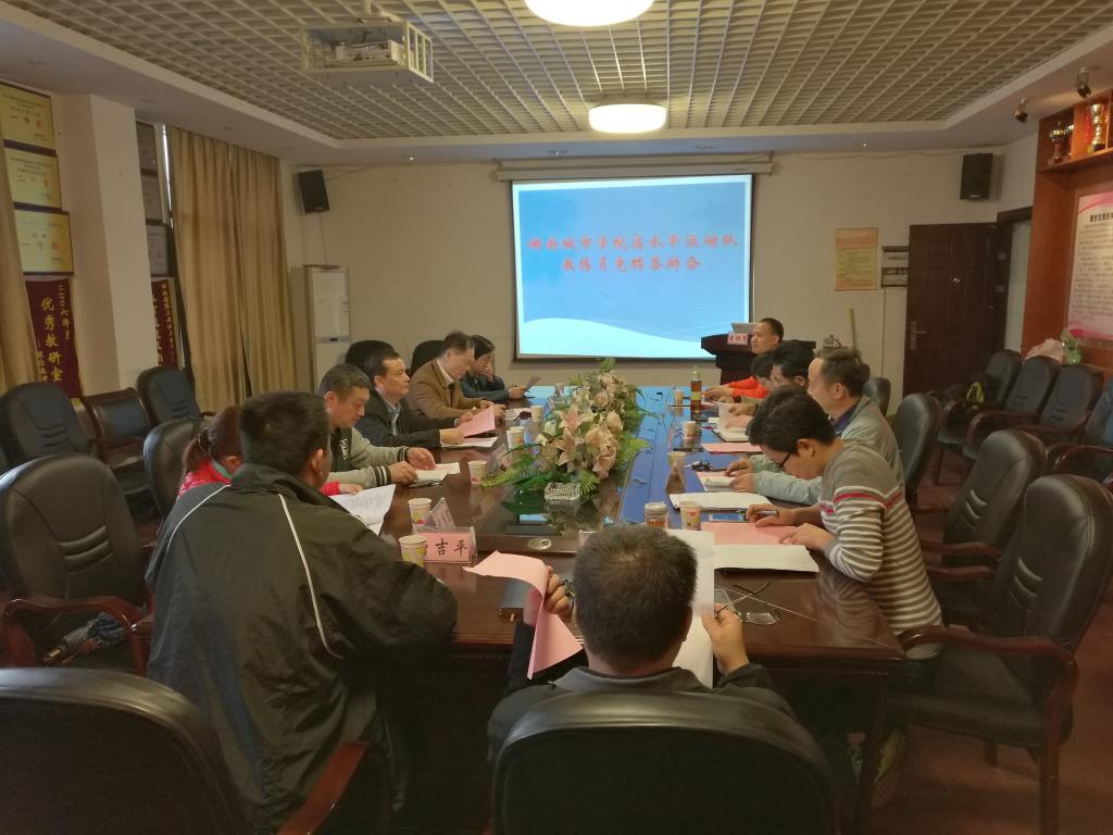 (本网讯)为备战2018年湖南省第十一届省大学生运动会,力争在省大学生运动会上取得优异成绩,4月9日上午,金年金官网高水平体育运动代表队主教练竞聘大会在体育学院会议室召开,副校长雷存喜,湖南省教学指导委员会委员、长沙学院体育部部长曾一兵教授,湖南省教学指导委员会委员、长沙师范学院体育系主任陈捷教授,教务处相关负责人、体育学院班子成员出席会议并担任竞聘专家。