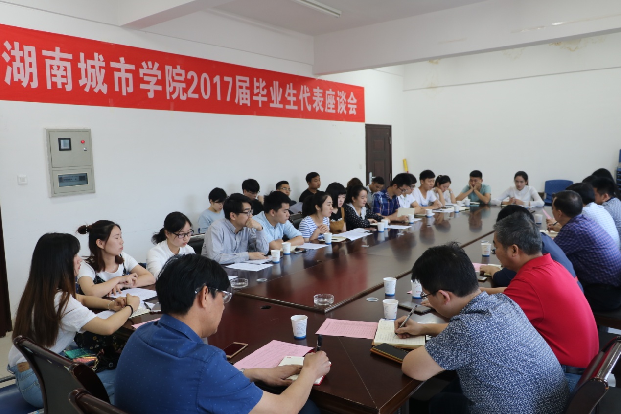 (本网讯)5月26日上午,金年金官网2017届毕业生代表座谈会在二办公楼518会议室举行。副校长雷存喜、谭献良,学校相关部门负责人,来自10个学院的17位毕业生代表以及3名肄业生代表参加了此次座谈会。