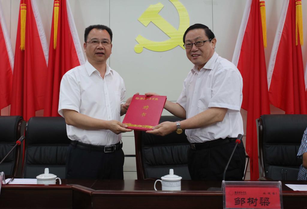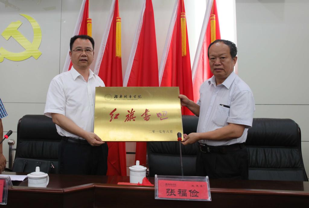张福俭向金年金官网授予“红旗出版社中国特色社会主义体系(益阳)研究中心”、“红旗书吧”牌匾,党委书记罗成翼和校长李建奇代表学校接牌。随后,张福俭向金年金官网赠送以“学习习近平总书记系列重要讲话,为实现中华民族伟大复兴中国梦而奋斗”为主题的精品图书,李建奇代表学校向红旗出版社颁发捐赠证书,并聘任邹树梁教授为金年金官网兼职教授。