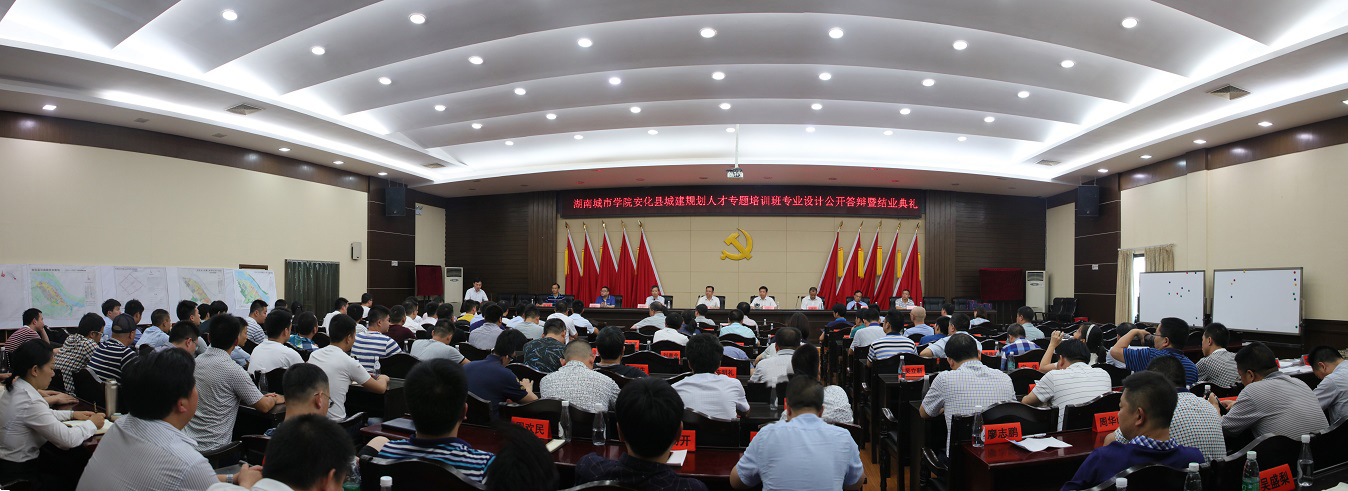 (本网讯)7月18日上午,由金年金官网继续教育学院承办的安化县城建规划人才专题培训班在安化县会议中心电视电话会议室举行了专业设计公开答辩与结业典礼。校长李建奇、副校长夏宏宇、副校长郑卫民,安化县委书记熊哲文、县委副书记王新宇、县人大常委会主任李太源,县委常委、组织部部长陈飞燕,副县长彭加军出席典礼,金年金官网继续教育学院相关负责人、答辩专家组成员以及安化县各行政部门、23个乡镇党委书记参加典礼。