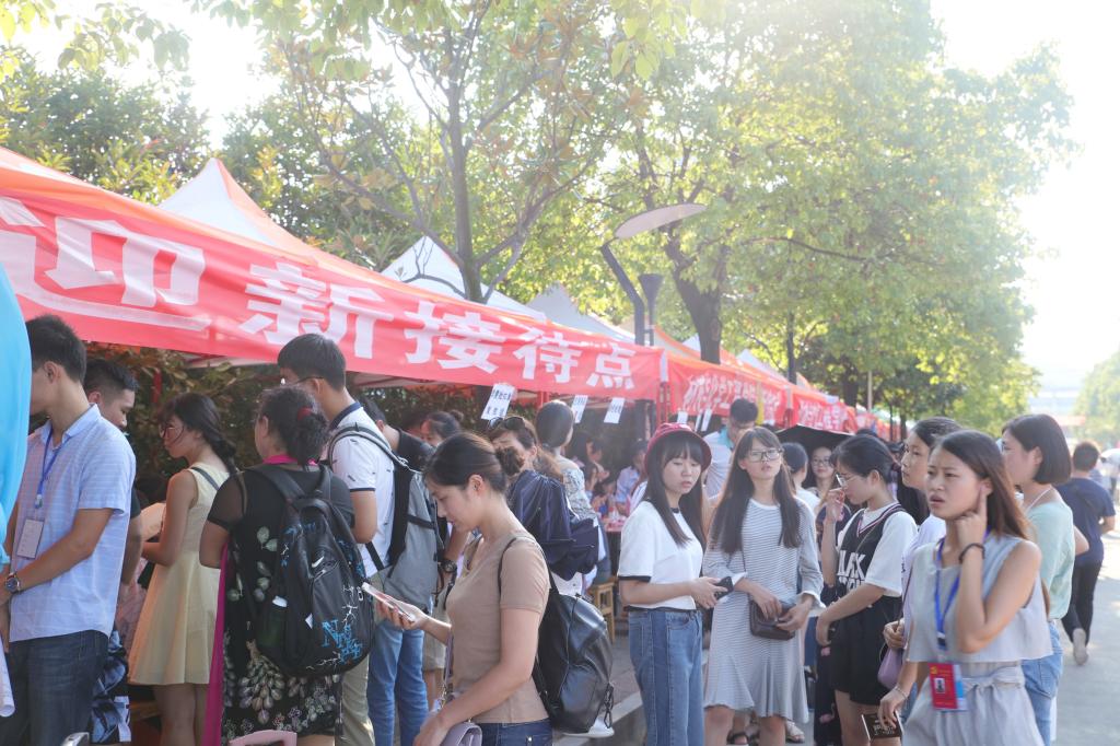 在人潮涌动的校园,迎新标语、迎新大巴随处可见,新生报到流程、学院介绍、专业介绍、名师简介、学生风采等展板整齐排列。2017级新生在迎新工作人员的引导下,逐一完成交验录取通知书,填写登记表,递交档案,领取缴费卡、军训服,领取宿舍钥匙并安顿住宿等各项报到事宜。早已守候多时的志愿者们以饱满的精神状态迎接新生的到来,他们真诚周到的服务,亲切温暖的帮助为远道奔波而来的学子及家长褪去了许多疲惫。