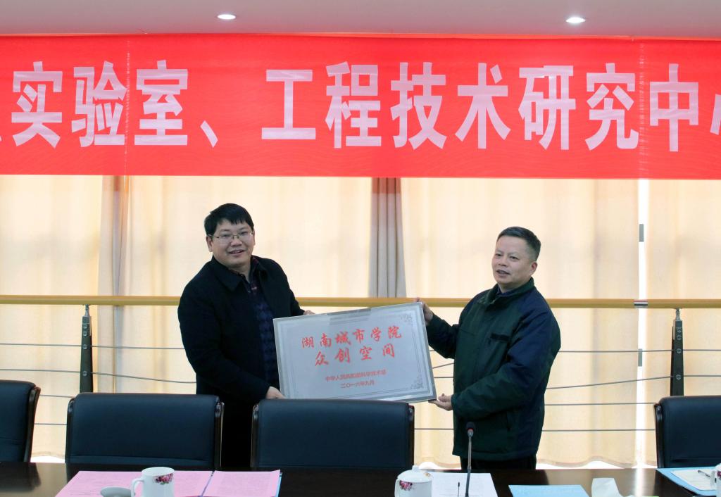 (本网讯)12月22日下午,省科技厅副厅长贺修铭、科研条件与基础研究处处长彭敬东、益阳市科技局副局长欧小娥一行来校,为金年金官网获批的国家级众创空间、湖南省重点实验室、工程技术研究中心授牌,并参加省重点实验室学术委员会会议。在家的校领导,各二级学院院长,党政办、宣传部、科研处、教务处、质控中心负责人参加会议。会议由校长李建奇主持。