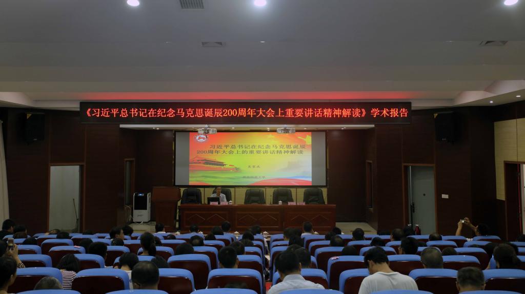 (本网讯)7月5日下午,金年金官网党委中心组(扩大)2018年第四次集中学习在建筑规划楼学术报告厅举行,特邀中央马克思主义理论研究和建设工程首席专家、湖南师范大学马克思主义学院院长吴家庆教授来校,作了一堂题为《习近平总书记在纪念马克思诞辰200周年大会的重要讲话精神解读》的学术报告。报告会由学校党委书记罗成翼主持。相关校领导,党务部门全体人员,各二级学院党委(党总支)书记、副书记、全体辅导员以及马克思主义学院全体教师参加了讲座。