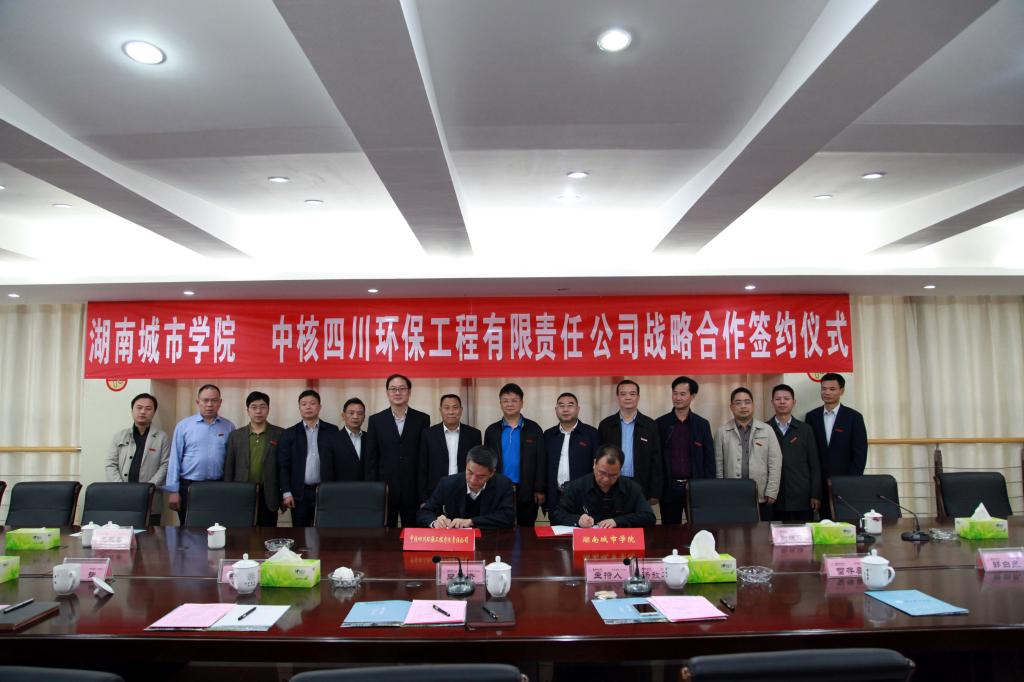 (本网讯)2018年10月16日下午,金年金官网与中核四川环保工程有限责任公司校企合作战略协议签约仪式在办公楼一会议室举行。中核四川环保工程有限责任公司总经理、党委副书记尤永春,人力资源总监谢晓峰和人力资源处、办公室相关人员,校领导李建奇、汤放华、郑卫民、雷存喜、李斌和有关部门、二级学院负责人出席签约仪式。签约仪式由党委副书记汤放华主持。