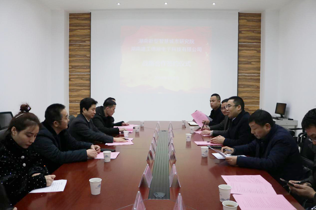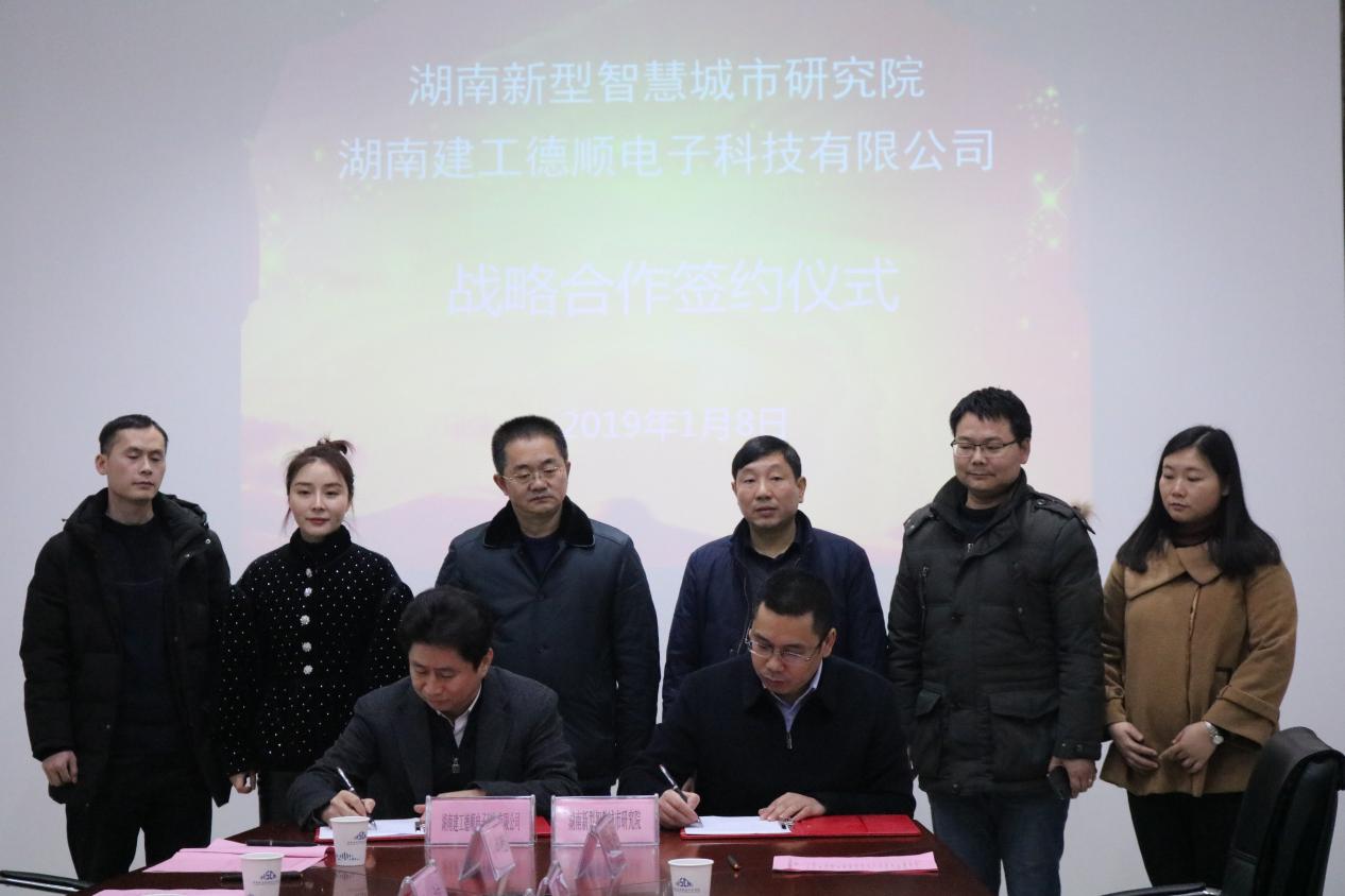 (本网讯)2019年1月8日下午,金年金官网与湖南建工德顺电子科技有限公司(以下简称建工德顺)战略合作协议签约仪式在创新创业楼二楼会议室举行。省建工集团党委副书记陈克军、建工德顺董事长谢建华及部分公司高管,副校长谭献良、智慧城市研究院相关负责人出席签约仪式。签约仪式由智慧城市研究院院长李梦醒主持。