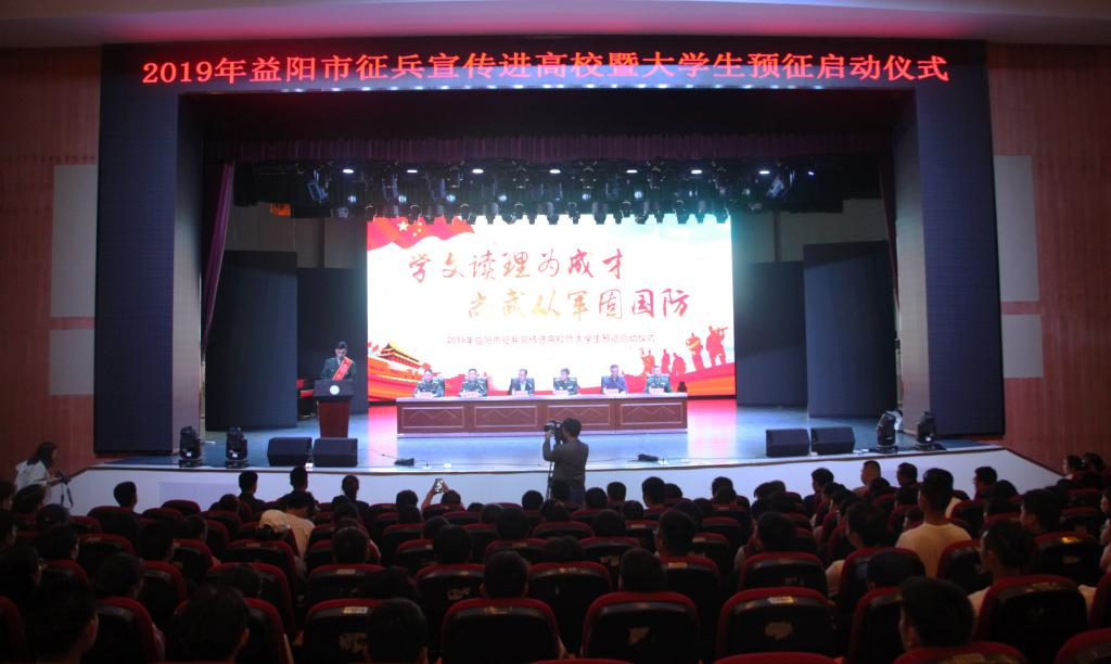 (本网讯)2019年4月19日下午,2019年益阳市征兵宣传进高校暨大学生预征启动仪式在金年金官网音乐厅隆重举行。益阳军分区司令员席尚平,市征兵办公室主任、军分区动员处处长肖尊华,资阳区人武部部长裴庆华,赫山区人武部部长张永发,校长李建奇、副校长雷存喜以及益阳四所高校400余名师生代表参加。仪式由雷存喜主持。