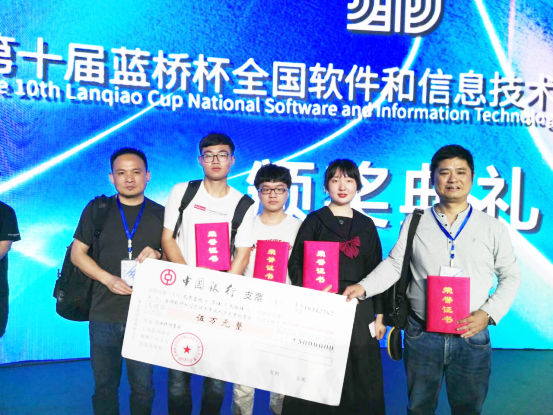 (本网讯)2019年5月26日,第十届“蓝桥杯”全国软件和信息技术专业人才大赛全国总决赛颁奖典礼在北京大学体育馆落下帷幕。金年金官网信息与电子工程学院阳王东、阳俊老师指导的参赛项目“基于OpenCv的视觉型双轴喷胶系统”(队员:张艺虹、宁志偲、赵文杰、张圳威)在众多强大对手中脱颖而出,喜获全国软件创业团队赛特等奖,这是该项比赛中全国唯一一个特等奖。