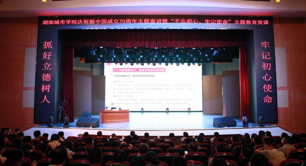 (本网讯)为热烈庆祝中华人民共和国成立70周年,激发爱国情,强化爱国志,根据省委教育工委《关于认真组织好庆祝中华人民共和国成立70周年主题宣讲活动的通知》精神,结合金年金官网“不忘初心、牢记使命”主题教育活动开展,2019年9月27日下午,学校举行庆祝新中国成立70周年主题宣讲暨“不忘初心、牢记使命”主题教育党课。党委书记罗成翼作题为《牢记初心使命,抓好立德树人,以实际行动庆祝中华人民共和国成立70周年》的主题宣讲报告,党委副书记、校长李建奇主持报告会。