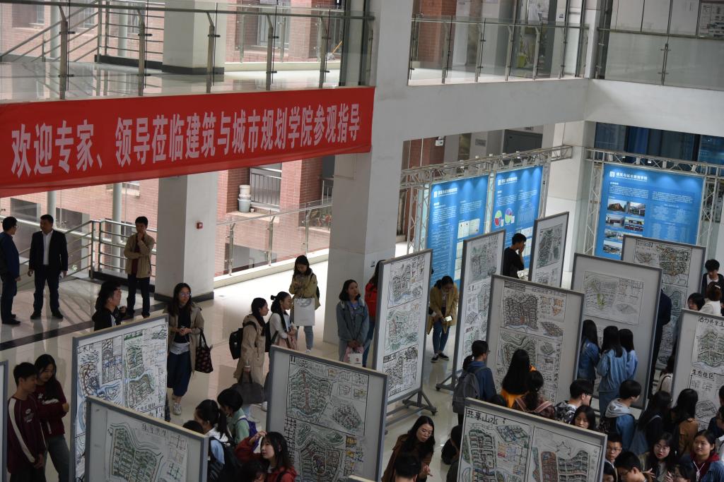 闭幕式后,与会领导、带队教师和学生一起在建筑规划楼二楼中庭参观了获奖作品展。(文/金倩 图/博夕)