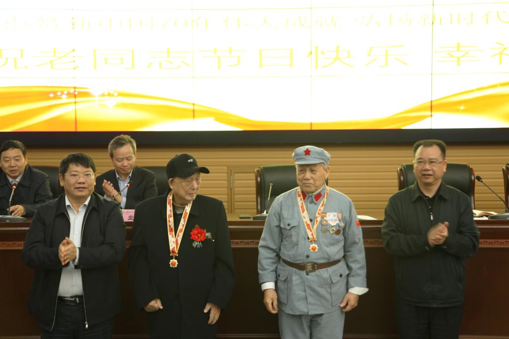 随后,与会领导为离退休老干部颁发“庆祝中华人民共和国成立70周年”纪念章,给金婚老同志赠送纪念照,给今年的寿星赠送“寿”字幅,表达了良好祝愿,并与大家合影留念。