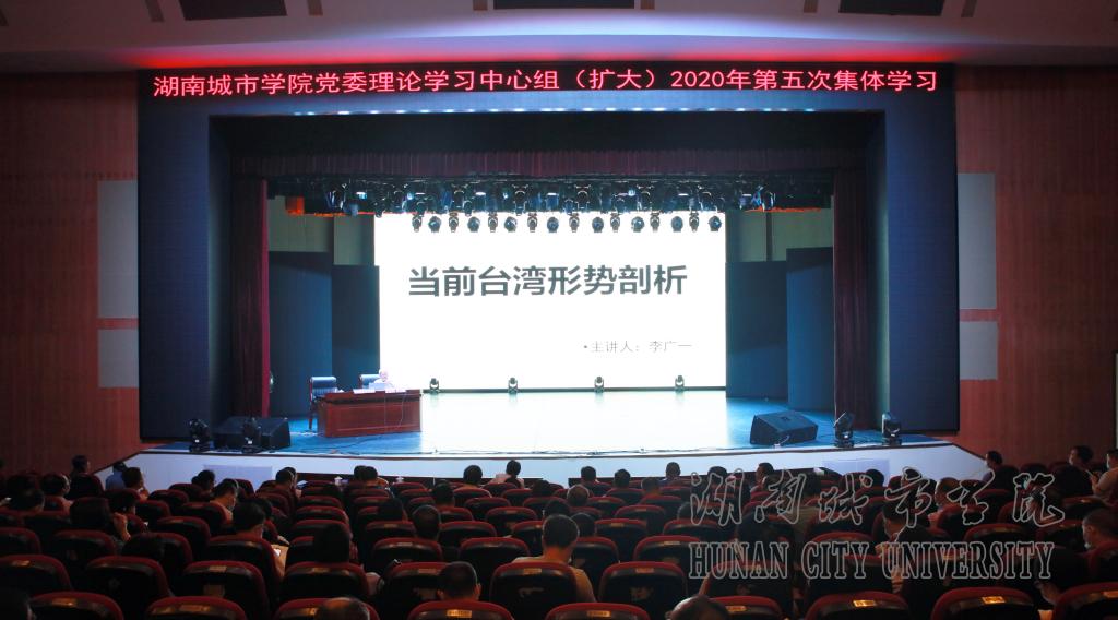 (本网讯)2020年6月18日,学校党委理论学习中心组(扩大)第五次集体学习在音乐厅举行。湘潭大学李广一教授应邀为党委理论学习中心组作《当前台湾形势剖析》的主题讲座。讲座由纪委书记姚春梅主持。在家校领导,全体处级干部、辅导员、马克思主义学院教师,宣传部、学生工作部、团委全体教职工聆听了讲座。