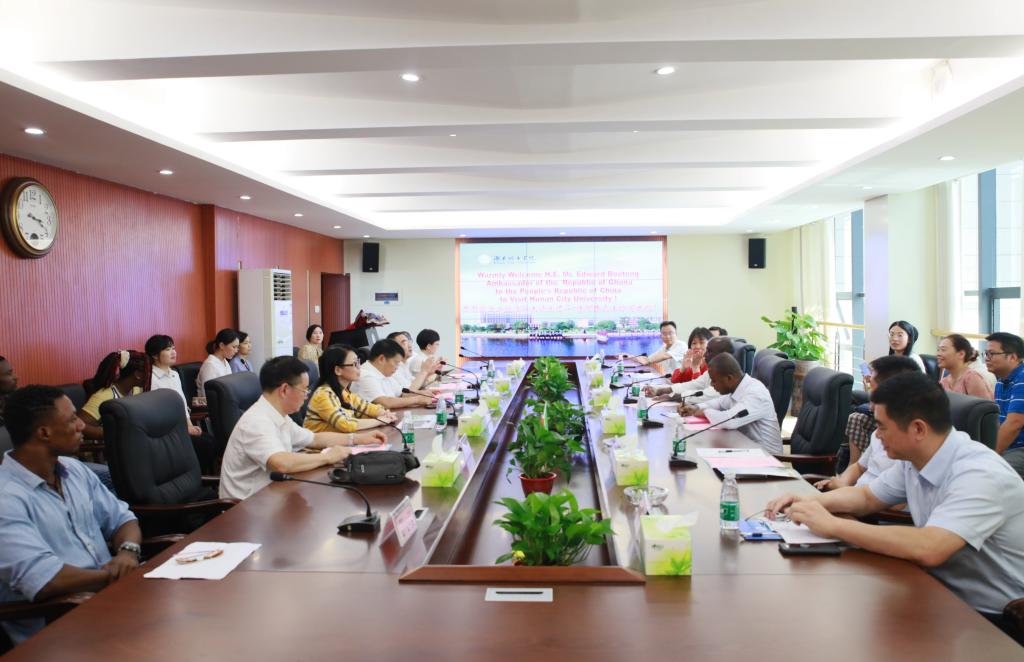 罗成翼对爱德华•博阿滕大使一行来访表示热烈欢迎。他指出,学校坚持开放办学,国际合作交流成效明显,先后与加纳、新西兰、马来西亚、美国、澳门等国家和地区高校开展合作办学。多年来,学校重视与非洲尤其是加纳的合作交流,常年招有加纳籍留学生,并与加纳海岸角大学合作共建孔子学院。四年多来,海岸角大学孔子学院运行良好,成为金年金官网与海岸角大学合作、汉语文化交流、对接地方政府行业合作以及兄弟单位学术交流的一个综合平台。今天,大使先生一行莅临金年金官网,共同探讨学校与加纳进一步合作事宜,必将有利于深化与拓展双方之间的合作,希望我们的交往更加密切,合作更加紧密,让我们的友谊跨越大洋,携手构建中非命运共同体。