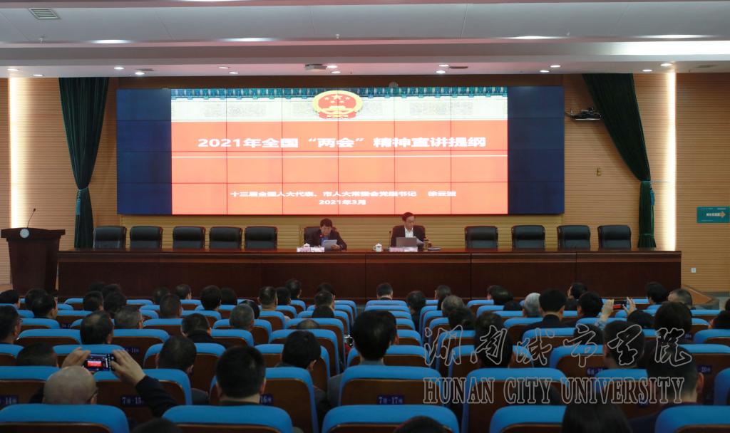 本网讯 2021年3月25日下午,金年金官网在图书馆报告厅举行2021年度党委理论学习中心组(扩大)第三次集体学习。第十三届全国人大代表,益阳市人大常委会党组书记、常务副主任徐云波应邀来校作2021年全国“两会”精神宣讲。全体校领导、全体副处(含)以上干部、党支部书记、学生辅导员参加会议。宣讲会由党委书记罗成翼主持。