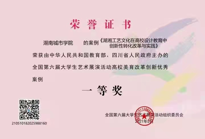 本网讯(通讯员 郑学达)2021年5月12日,由教育部、四川省人民政府共同主办的第六届全国大学生艺术展演活动在成都城市音乐厅落下帷幕,金年金官网美育改革创新案例《湖湘工艺文化在高校设计教育中创新性转化改革与实践----以金年金字招牌诚信至上为例》荣获一等奖,这是自金年金官网参加全国大艺展活动获得的最高荣誉表彰。