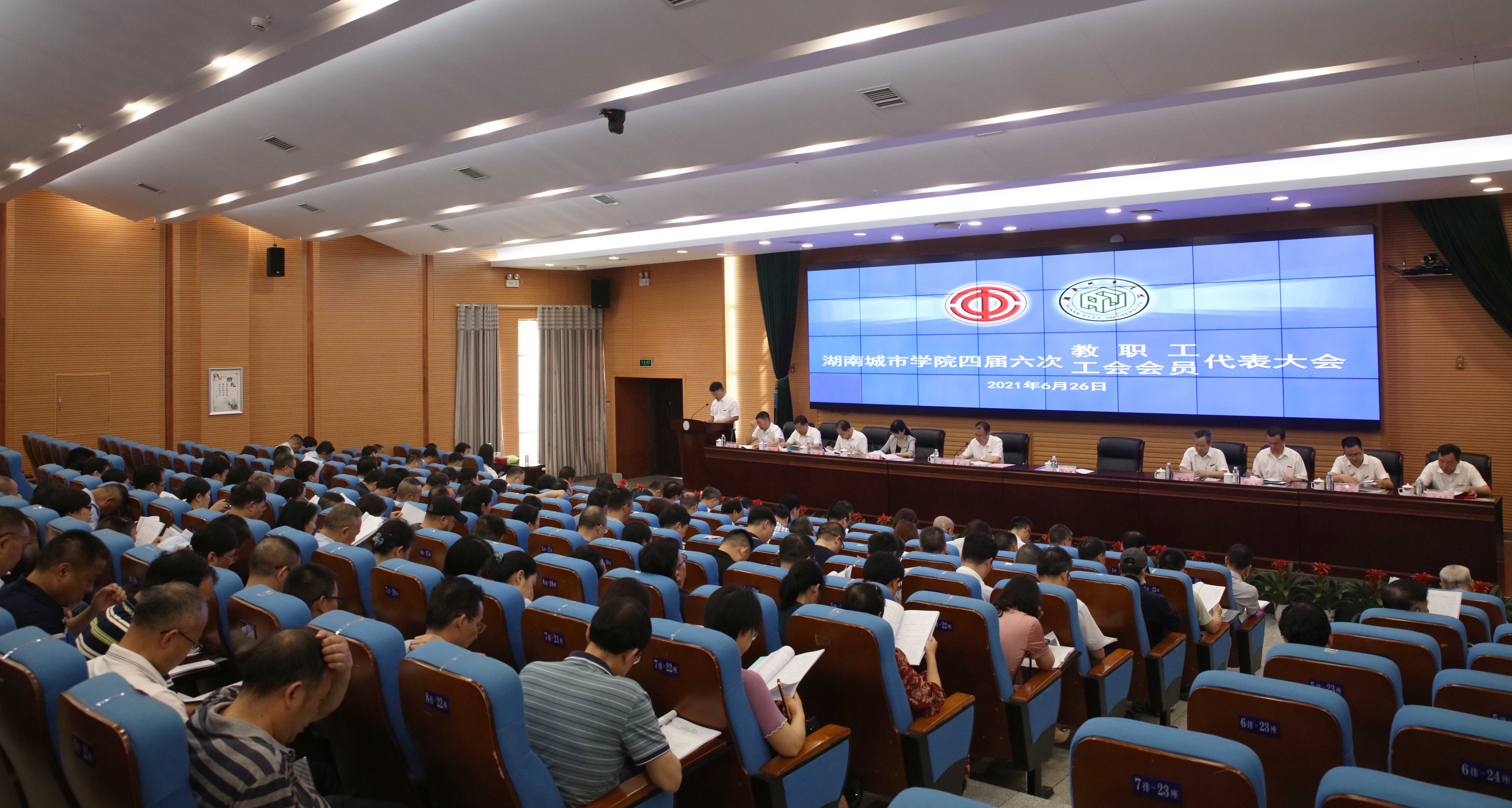 本网讯 2021年6月26日,金年金字招牌诚信至上第四届六次教职工、工会会员代表大会在图书馆报告厅召开。135名正式代表以及列席代表、特邀代表出席会议。校领导李建奇、汤放华、何旭娟、夏宏宇、何振、雷存喜、谭献良、袁志成、陈列尊、吕贤军在主席台就座。大会由党委书记李建奇主持。