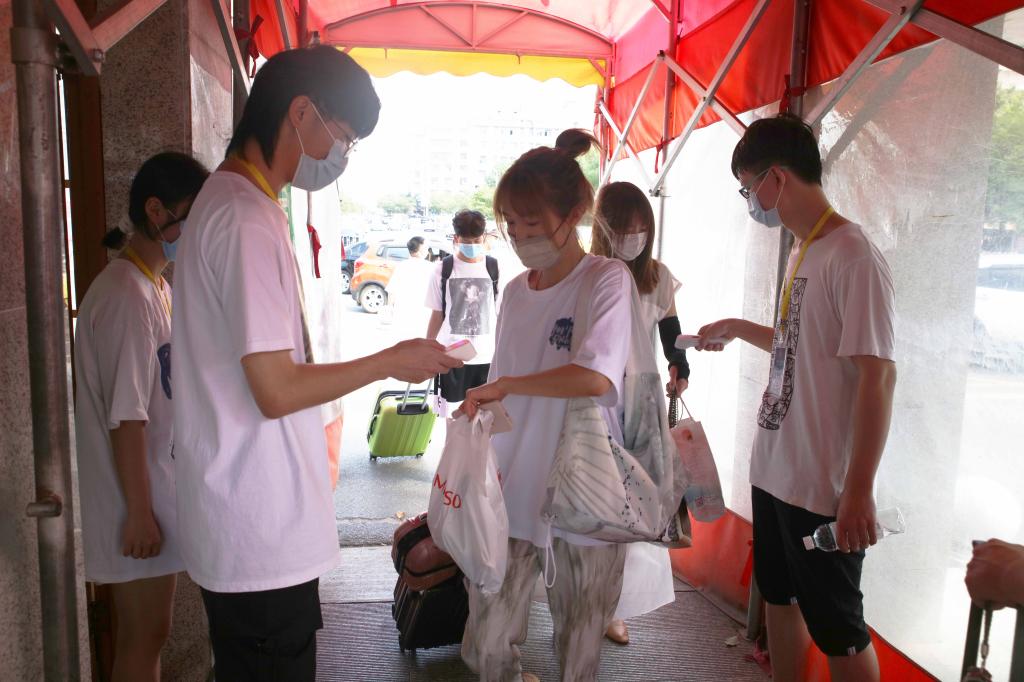 为了保障迎新工作顺利开展,学校各部门通力合作,推进信息化、人性化和便捷化服务,多举措暖心迎“萌新”。在学校南门和北门入口处,在学生志愿者的温馨提示和耐心服务下,新生须出示健康码、行程码,并接受体温测试,这是今年金年金官网2021级新生入校首先必须完成的一套防疫规定动作。学校还在现场准备了洗手液、口罩等防疫物品,用心用情织密织牢校园防疫网,为新生顺利报到保驾护航。
