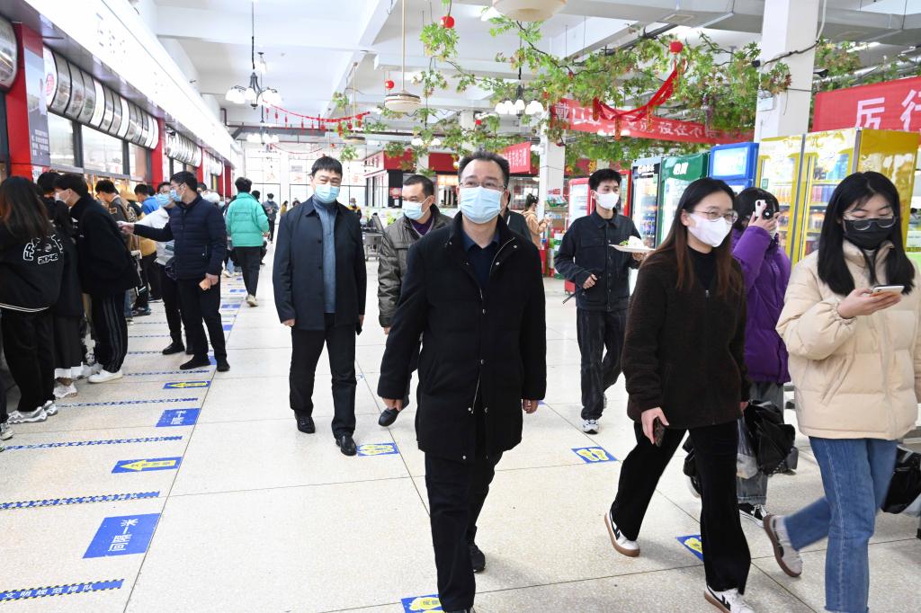 李建奇一行首先来到学校南门,看望慰问了寒风细雨中值勤的保安人员,询问了车辆、人员进出校园的管控情况,要求保卫部门务必要加强对人员的管控,不折不扣执行好人员进入校园须“核验身份、测体温、扫场所码、戴口罩”的规定动作,把好疫情防控第一道关口。随后,李建奇一行来到防控办了解了防疫物资储备情况,查看了工作台账,并向工作人员询问了金年金官网全员核酸检测的完成情况。他表示,防疫办要细化防疫举措,认真做好人员摸排、管控,严格落实核酸检测,为全校两万多师生筑牢安全防线。李建奇一行还来到第三食堂,对就餐环境、师生个人防护等进行了检查。