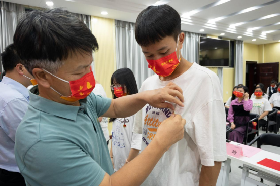 汤放华为新团员佩戴团徽。