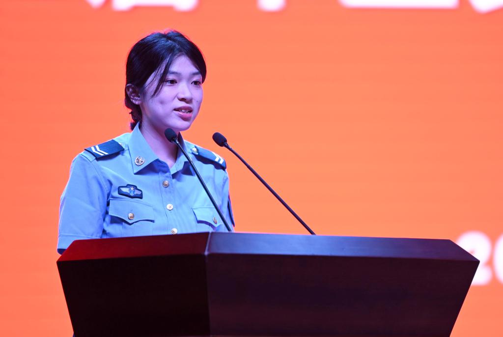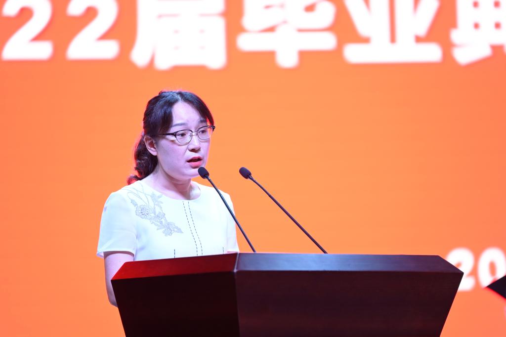 教师代表机械与电气工程学院张闻芳老师发言。她期望同学们善待自己,学会担当、学会包容,不要轻易丢弃求知的欲望,始终坚定心中信念,永葆知识分子的良知与正义。