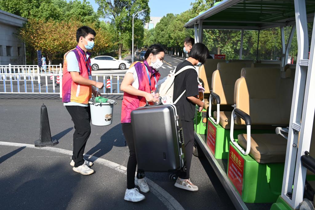 满载着新生和行李的电瓶车往复行驶在校门与迎新点之间。
