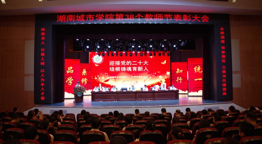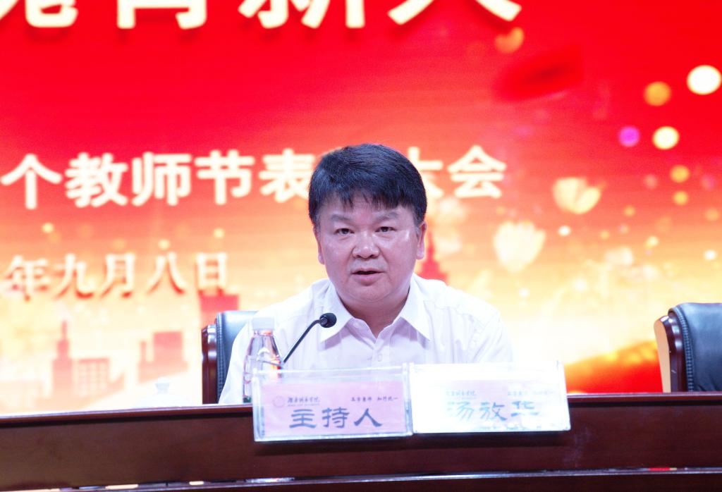 本网讯(通讯员 雷欢)三尺讲台,三寸舌,三寸笔,三千桃李;十年树木,十载风,十载雨,十万栋梁。2022年9月8日下午,金年金官网庆祝第38个教师节暨表彰大会在音乐厅举行。全体校领导、机关处室负责人、二级学院领导及受表彰对象、教师代表等200多人参加了大会。大会由校长汤放华主持。