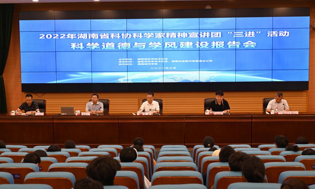 本网讯(通讯员 刘湛军)9月20日,2022年湖南省科协科学家精神宣讲团“三进”活动在金年金官网图书馆报告厅举行。省科协党组成员、副主席张辉学,湖南师范大学教授、博士生导师匡乐满,校长汤放华,副校长袁志成出席,160余名师生参加。活动由益阳市科协党组书记、主席曹卫兵主持。