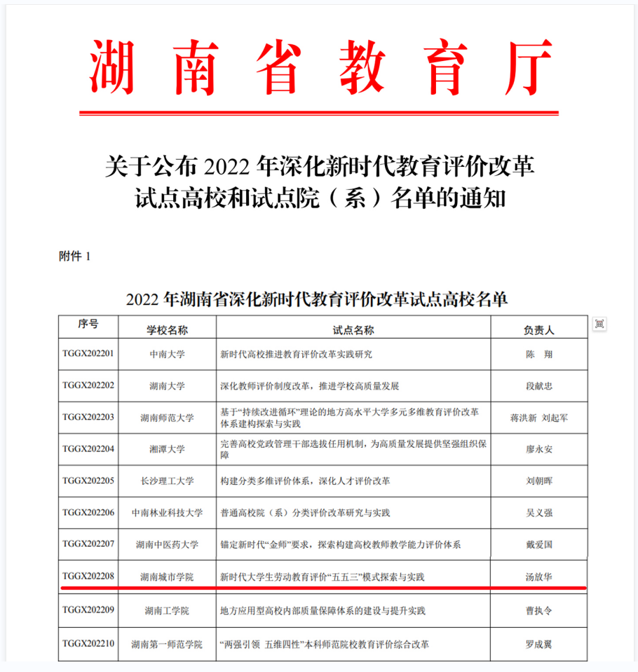 本网讯(通讯员 王立刚)近日,湖南省教育厅发布《关于公布2022年深化新时代教育评价改革试点高校和试点院(系)名单的通知》,金年金官网申报的“新时代大学生劳动教育评价‘五五三’模式探索与实践”成功获批改革试点高校。本次共立项15所高校,其中本科高校10所,高职院校5所。