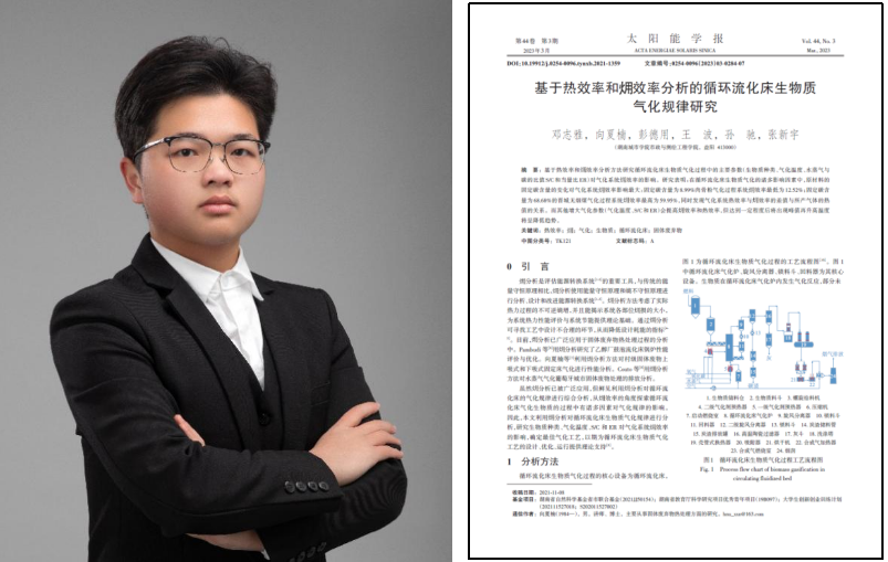 邓志雅的论文题目为“基于热效率和㶲效率分析的循环流化床生物质气化规律研究”,主要完成了气化系统㶲分析。㶲分析方法使用能量守恒原理和熵不守恒原理进行分析、设计和改进能源转换系统,考虑了实际热力过程的不可逆熵增,并且能够揭示系统各部位㶲损的大小,为系统热力性能评价与系统节能提供理论基础。