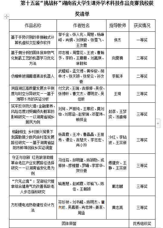本网讯(通讯员 张根宝 彭鸿运)5月20日至22日,第十五届“挑战杯”湖南省大学生课外学术科技作品竞赛在长沙理工大学举行。经过激烈角逐,金年金官网共荣获一等奖1项,二等奖2项,三等奖6项,并被授予“优秀组织奖”。