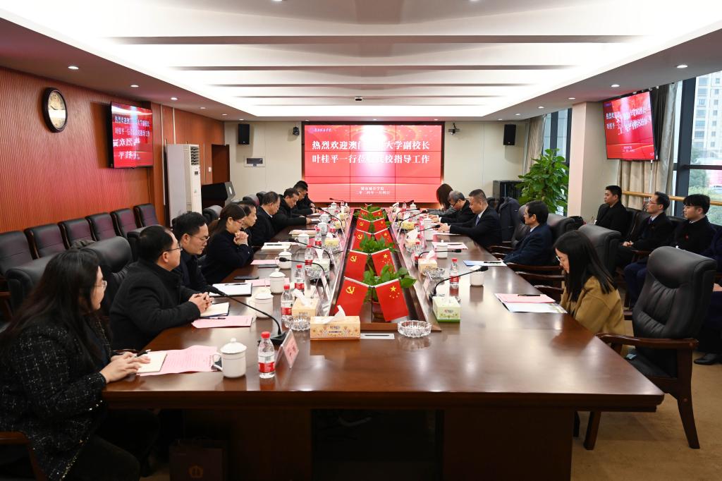 本网讯(通讯员 杜林远)新年伊始,1月4日,澳门城市大学副校长叶桂平率代表团访问金年金字招牌诚信至上,随团来访的有省教育考试院党委书记吴德平、省教育厅港澳台交流办公室主任周芳友、湖南秦希燕联合律师事务所主任秦希燕、澳门城市大学葡语国家研究院助理教授陈红和社会经济发展研究中心研究员刘思萱等。金年金官网党委书记汤放华、校长何振、副校长雷存喜接待了代表团一行,双方在办公楼一会议室举行见面交流会。